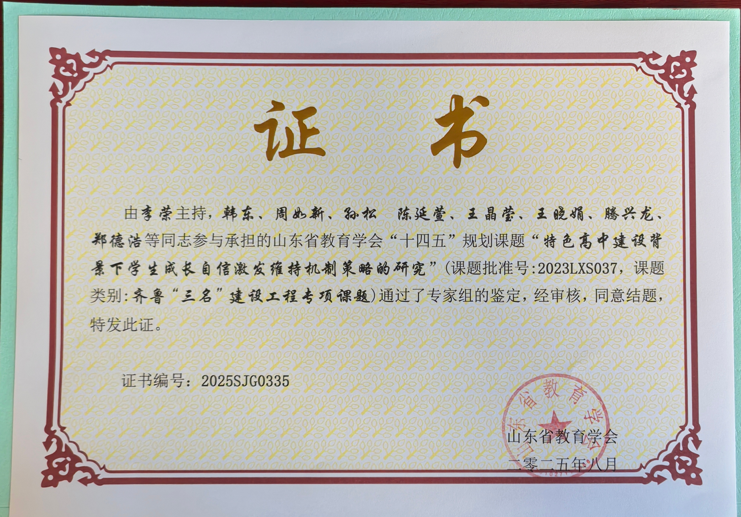 近日,济南回民中学李荣老师主持的山东省教育学会“十四五”规划课题《特色高中建设背景下学生成长自信激发维持机制策略的研究》,经专家评审,顺利通过结题鉴定,特此报喜!