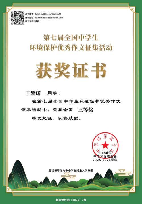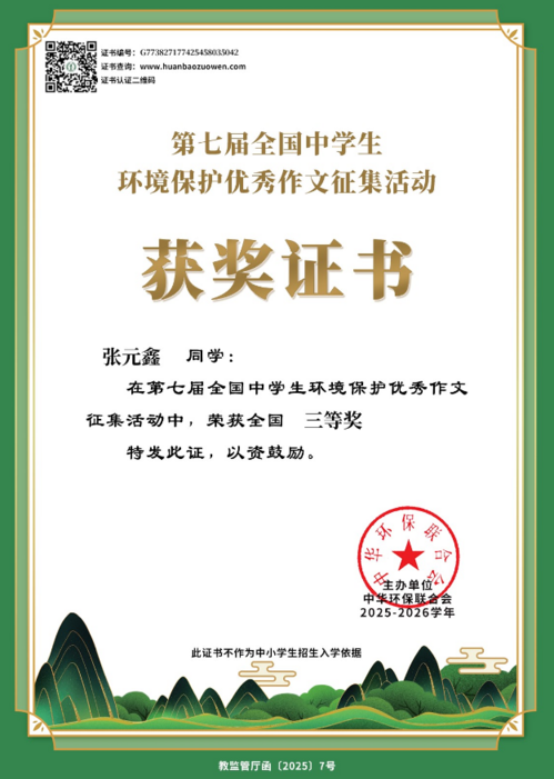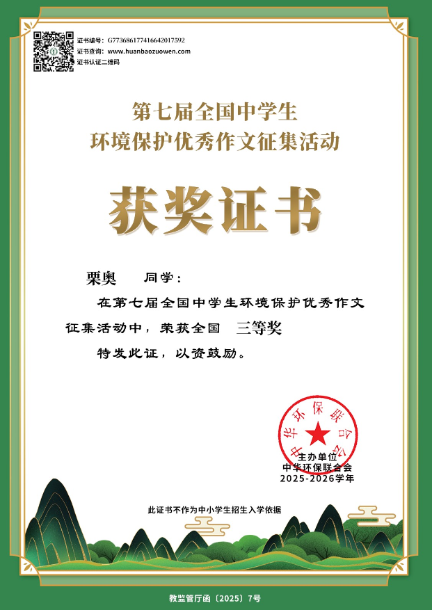 活动自2025年11月正式启动以来,搭建了分层级、全方位的赛事体系,历经学校初赛、省级复赛、全国决赛三个阶段,确保每一份优秀作品都能得到专业认可。参赛作品分为环保作文和研究性学习报告两部分,既鼓励学子们用文字抒发环保情怀,也倡导大家结合校园、社区的环保实践,开展调研分析,提出切实可行的环保解决方案。我校学子充分发挥想象力和创造力,呈现出一批主题鲜明、内容鲜活、情感真挚的优秀作品。其中李富杰、王紫诺、张元鑫、栗奥、朱恒文、张欣怡、刁新悦、张永怡、王嘉瑞、郭晨焱等同学荣获省级一、二、三等奖。有的学子以家乡的河流变迁为切入点,记录了生态治理带来的环境改善,字里行间满是对家乡的热爱;有的学子聚焦“双碳”目标,结合所学知识,探讨青少年在节能减排、绿色出行中的责任与行动;还有的学子通过调研校园垃圾分类、社区环保宣传等现状,提出了具有可操作性的改进建议,展现了中学生的环保素养和实践能力。
