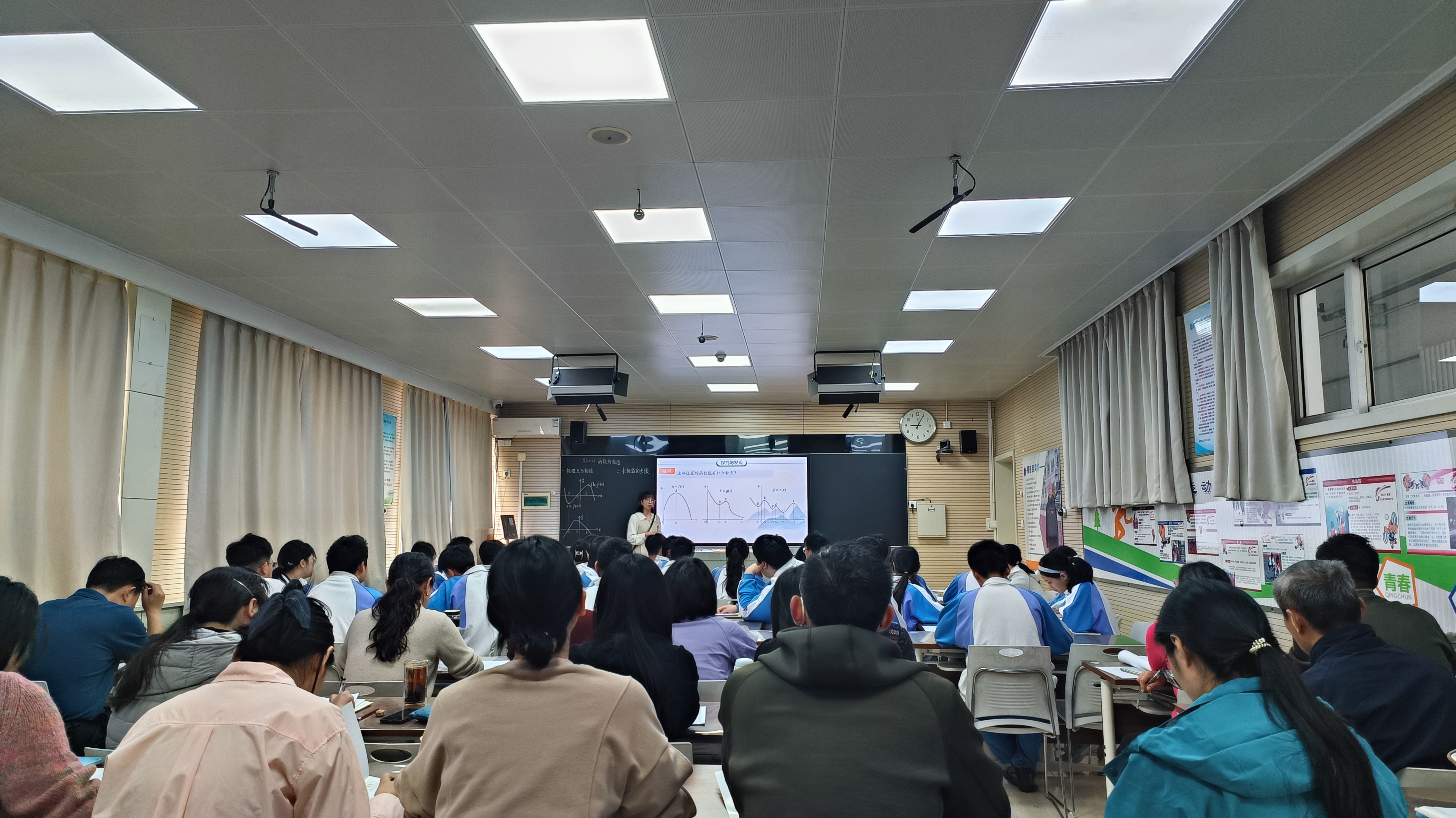 启动仪式后,青年教师王亚萍带来数学展示课《函数的极值》。课堂上,王老师以具体实例为切入点,引导学生抽象函数图象,借助图象直观感知 “波峰波谷”“单调性转折点”,自然生成极值概念,让学生充分体会类比、数形结合思想,有效发展数学抽象、数学建模核心素养。在新知探究环节,她以三次多项式函数为例,带领学生将可导函数极值点转化为导函数变号零点,系统梳理用导数求函数极值的方法与步骤,渗透函数与方程、转化与化归思想,强化学生数学运算、逻辑推理能力。课堂不仅有知识传授,更有价值引领。王老师以 “群山起伏” 为喻,引导学生辩证看待局部与整体、极值与最值的关系,树立全面看待事物的世界观与全局观,将立德树人根本任务融入数学课堂全过程。