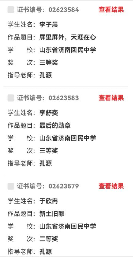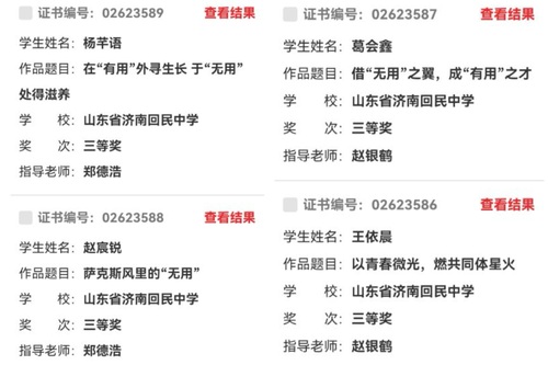 获奖作品主题鲜明、立意深刻,既围绕“有用与无用”“天涯与比邻”等大赛核心议题展开思辨,也融入了青春视角下对时代、家国、生活的独特感悟。从《在“有用”外寻生长 于“无用”处得滋养》的哲思探寻,到《以青春微光,燃共同体星火》的青春担当;从《数智时代,让“天涯”真成“比邻”》的时代洞察,到《我与姥姥的“比邻”与“天涯”》的温情叙事,每一篇作品都彰显了回中学子深厚的文化底蕴、敏锐的社会观察与真挚的家国情怀。 优异成绩的取得,离不开学校对语文教学与学生核心素养培育的高度重视,更离不开指导教师的悉心指导与辛勤付出。各位指导老师深耕教学、精准点拨,以专业的素养为学生搭建成长平台,助力学子在文学之路上绽放光彩。 此次获奖,不仅是对我校学子写作能力的充分肯定,更是学校落实立德树人根本任务、推进素质教育的生动体现。未来,济南回民中学将继续深耕语文教学,搭建更多展示平台,鼓励学子以笔为犁、以文铸魂,在文学的沃土上深耕不辍,书写更多青春华章! 表彰名单: