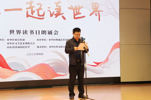 春风送暖,书香盈怀。4月17日,由市中区委宣传部、市中区文学艺术界联合会、山东省济南回民中学主办,市中区朗诵艺术家协会承办、市中区作家协会协办的“和你一起读世界”世界读书日朗诵会在济南回民中学温情启幕。市中区文学艺术界联合会党组书记、主席李富河,市中区文联党组成员、副主席刘同华,山东省济南回民中学党委副书记、校长柳宝福、党委书记周全海、副校长李静,济南市图书馆少儿部副主任司娟,市中区作家协会主席陈忠,市中区朗诵艺术家协会秘书长王彰麟出席活动,济南回民中学师生三百余人参加活动。