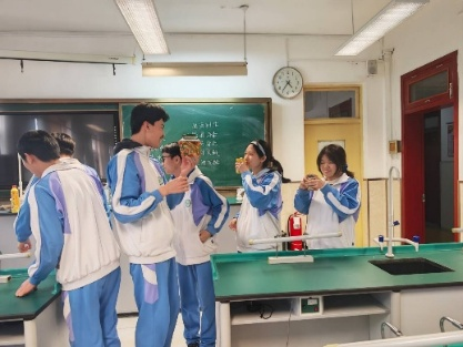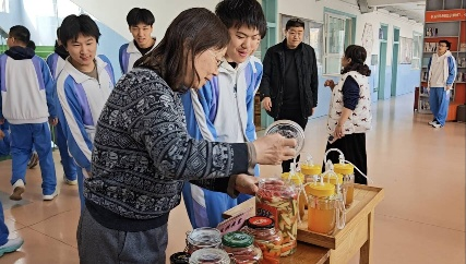 全校共享,知识在互动中传播 实验成果不仅在实验室内完成,更走出实验室,走向教学楼大厅,面向全校师生进行集中展示。展台前,时常可见师生驻足细观,或对比泡菜与果酒的色泽差异,或翻阅实验报告探究数据背后的原理。生物教师也借此机会开展现场教学,引导学生从对比中理解微生物种类、环境条件与发酵产物之间的内在联系。全校师生在“看、闻、问、思”中,共同感受传统发酵技艺背后的科学魅力。