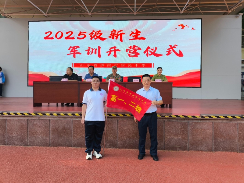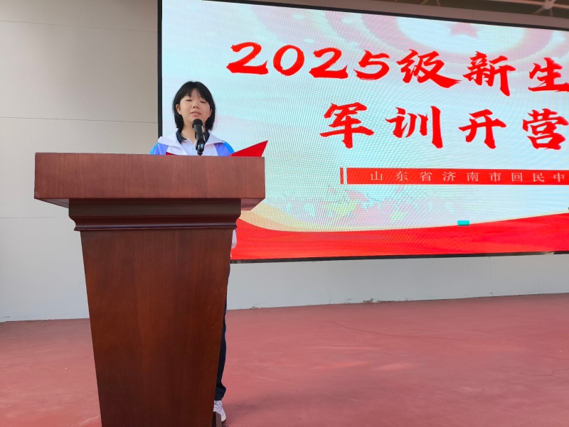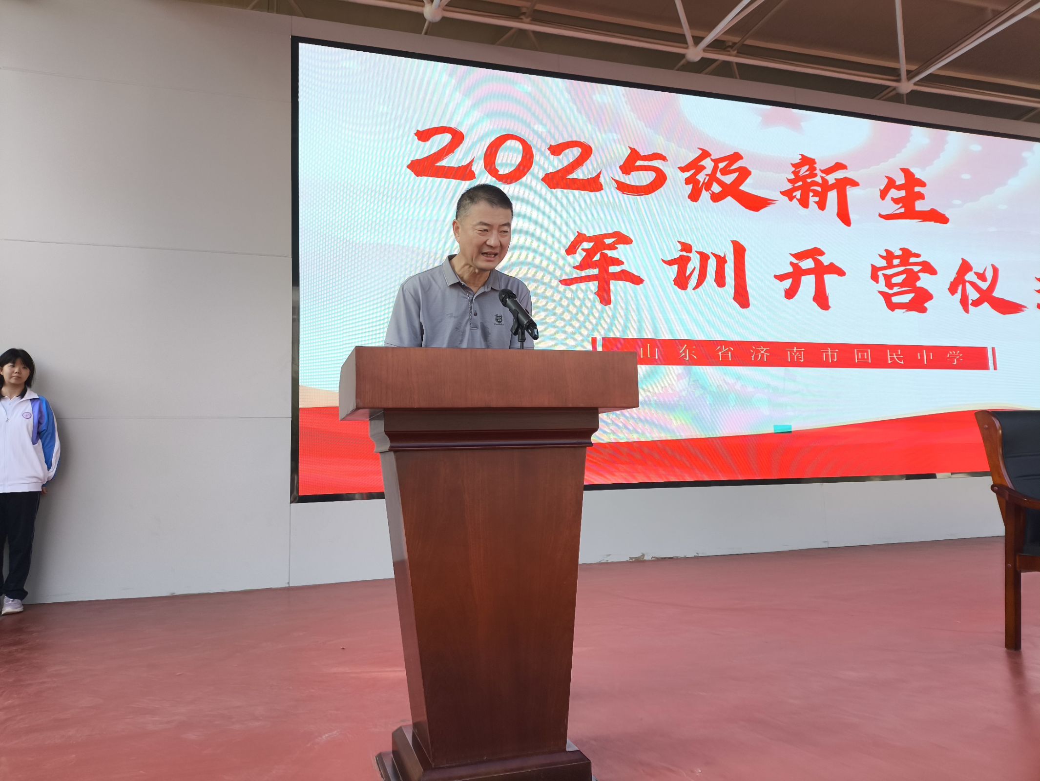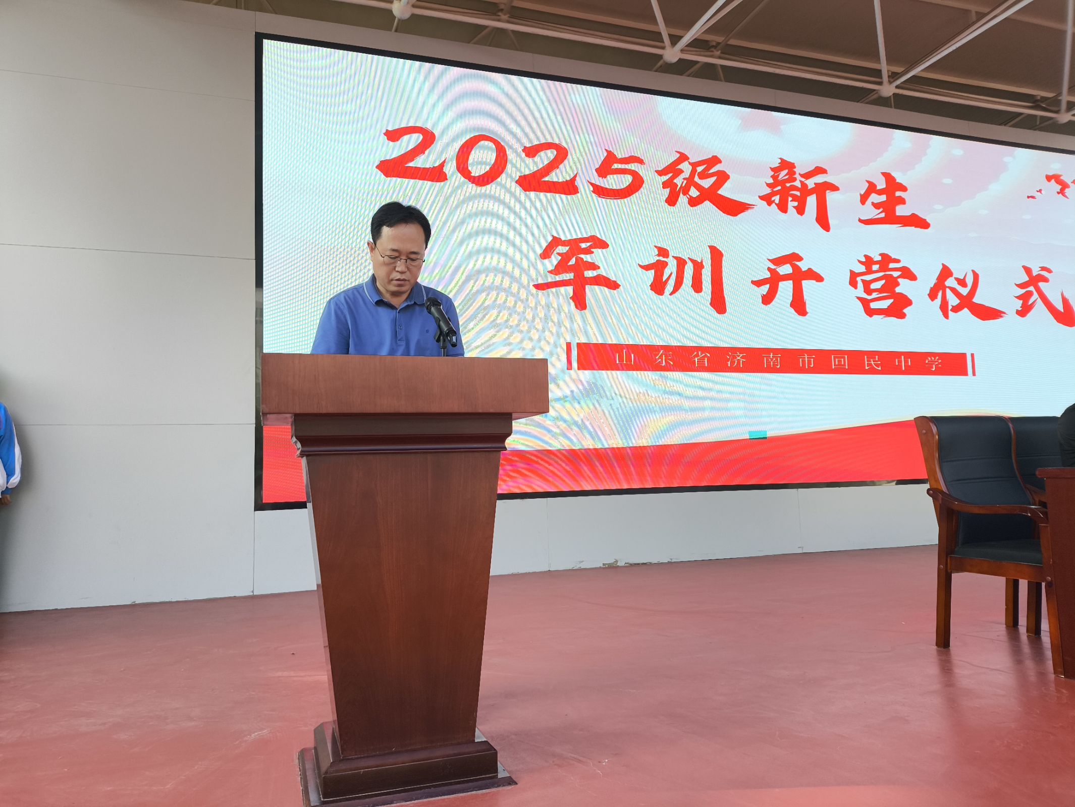 校长柳宝福致辞,强调军人是“捐躯赴国难,视死忽如归”的无畏,他们有着钢铁般的意志,他们在训练场上无数次的挥汗如雨,才铸就了战场上的英勇无畏;这种军人品格,正是“天道酬勤”的最好例证。军训更让我们懂得敬畏规则,尊重生命。军训是青春的“第一课”,我们要以军训为起点,坚持“读书”求知,用知识武装头脑;厚植“爱国”情怀,把个人理想融入祖国发展;树立“自信”品格,敢于面对任何挑战。希望大家以“强国一代”的使命感,传承红色基因,在军训中做到学会吃苦,锻造坚韧不拔的意志;学会团结,凝聚集体奋斗的力量;学会自律,培养令行禁止的作风。仪式最后,柳宝福宣布:山东省济南回民中学2025级新生军训现在开始!
