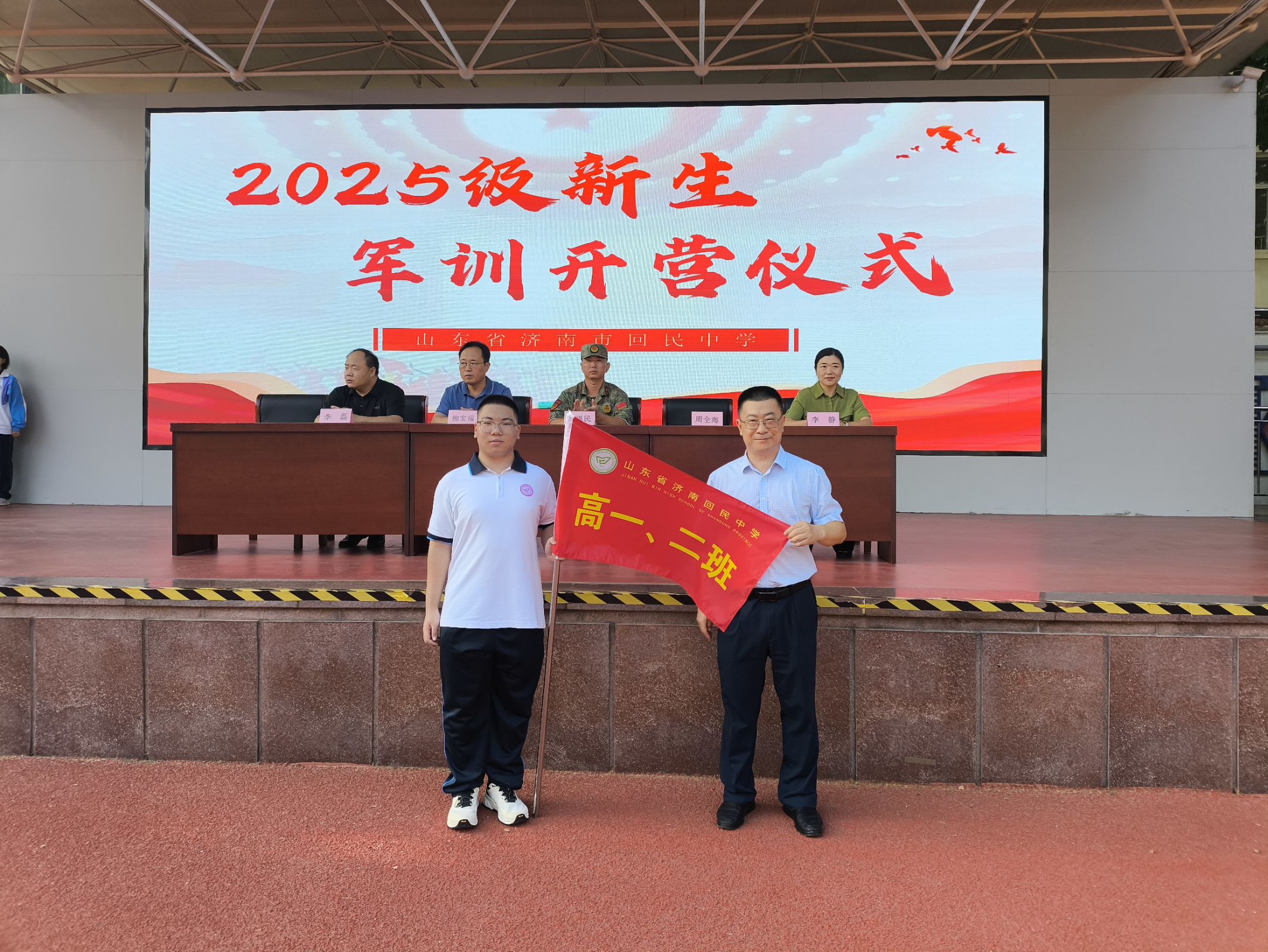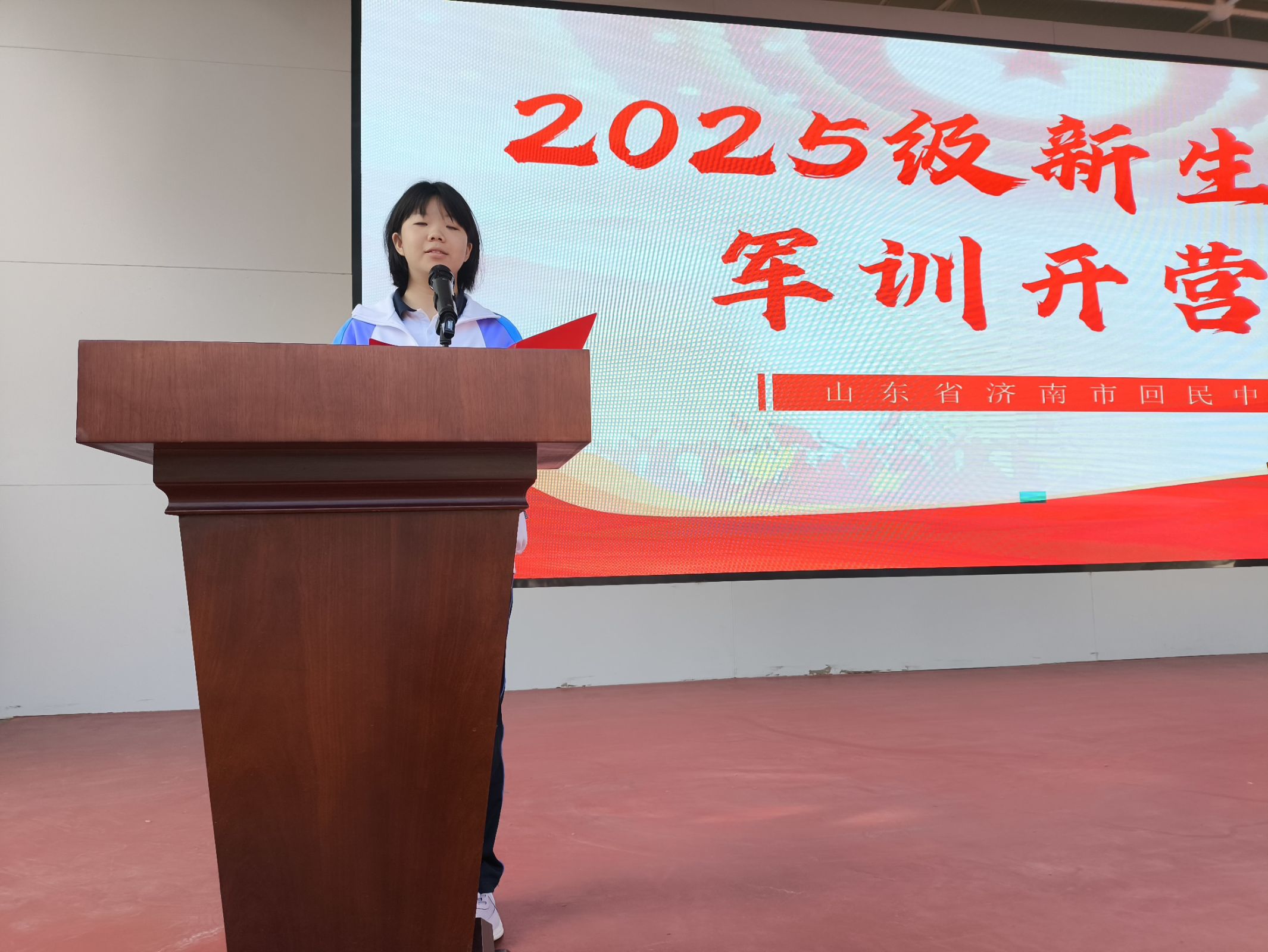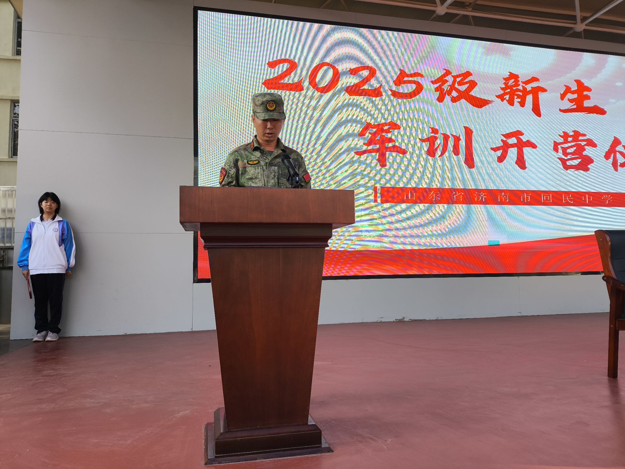 校长柳宝福致辞,强调军人是“捐躯赴国难,视死忽如归”的无畏,他们有着钢铁般的意志,他们在训练场上无数次的挥汗如雨,才铸就了战场上的英勇无畏;这种军人品格,正是“天道酬勤”的最好例证。军训更让我们懂得敬畏规则,尊重生命。军训是青春的“第一课”,我们要以军训为起点,坚持“读书”求知,用知识武装头脑;厚植“爱国”情怀,把个人理想融入祖国发展;树立“自信”品格,敢于面对任何挑战。希望大家以“强国一代”的使命感,传承红色基因,在军训中做到学会吃苦,锻造坚韧不拔的意志;学会团结,凝聚集体奋斗的力量;学会自律,培养令行禁止的作风。仪式最后,柳宝福宣布:山东省济南回民中学2025级新生军训现在开始!